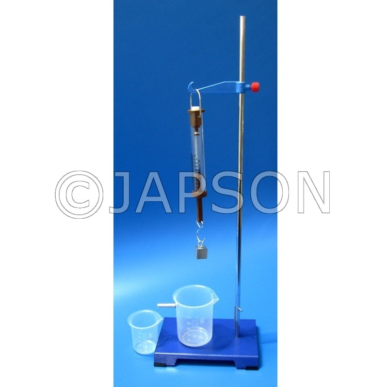 To demonstrate Archimedes's principle. The kit includes a 250-gram spring balance, one metal block with hook, one plastic displacement vessel with a capacity of 250ml and one plastic beaker with a capacity of 100ml. Supplied with a stand.