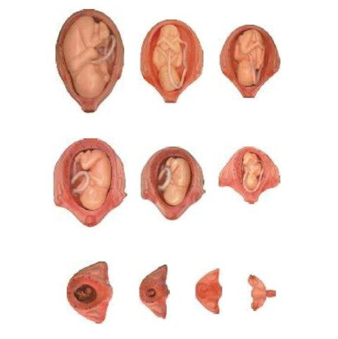Made of PVC and synthetic rubber. The model consist of 10 parts and shows the relationship between fetus and uterus during gestation period. | ||||