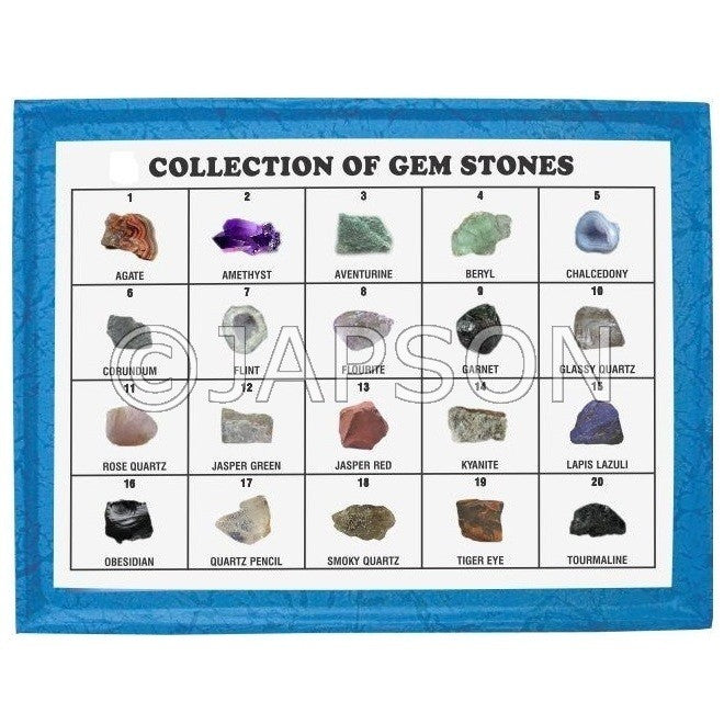 This Collection contains 20 Types of Gems Minerals Specimens.The Gems Minerals Specimens include Some of the following Agate, Amethyst, Aventurine, Beryl, Chalcedony, Corundum, Flint, Flourite, Garnet, Glassy Quartz, Rose Quartz, Jasper Green, Jasper Red, Kyanite, Lapis Lazuli, Obesidian, Quartz Pencil, Smoky Quartz, Tiger Eye & Tourmaline etc.