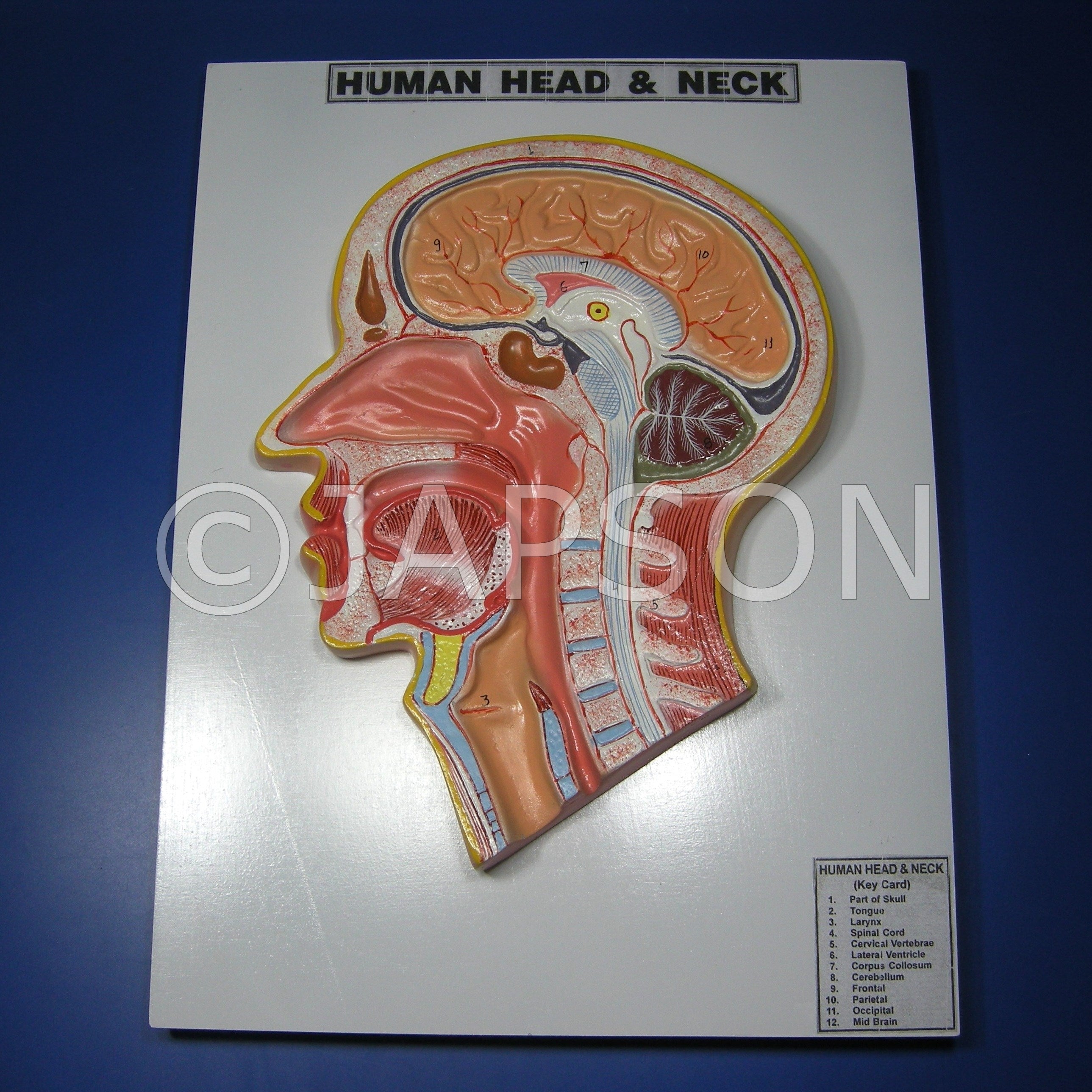 The model of human head and neck showing the all internal organs like median section of brain, nose, mouth and pharynx, larynx and vertebral column of the neck. Mounted on a base, appropriately coloured and numbered with keycard.