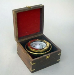 Marine Compass A 50 mm diameter, strong and durable marine compass, housed in a wooden box for protection and easy storage
