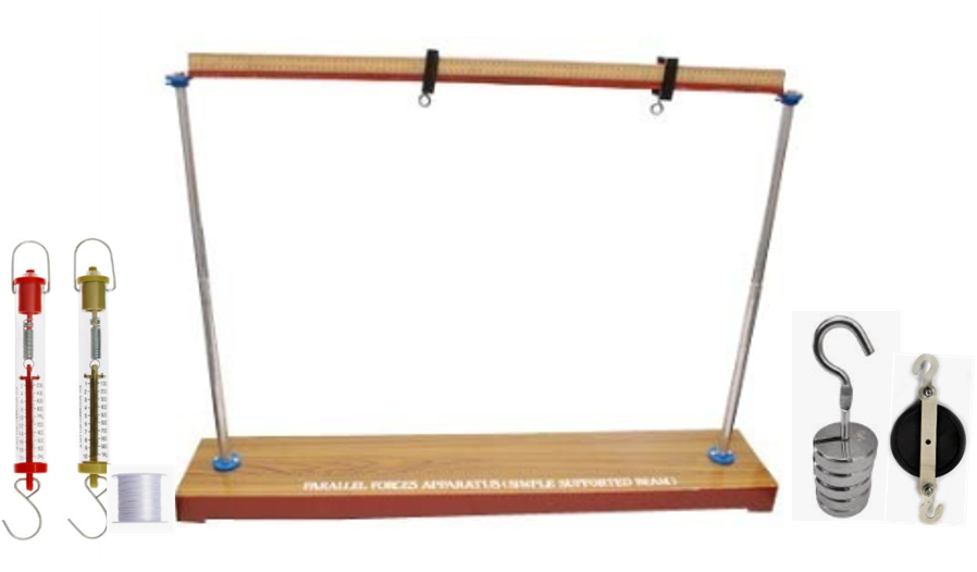 Design & Material: A lightweight, balanced meter scale with holes and metric graduations, allowing for easy suspension and accurate readings. Components: At least 2 spring balances to measure the applied force. A set of slotted weights with hooks for flexibility in adjusting weight values. A minimum of 2 holders for securing the setup and ensuring stability. A pulley to aid in the application of forces. Non-elastic strings to prevent stretching, ensuring precise measurements throughout the experiment.