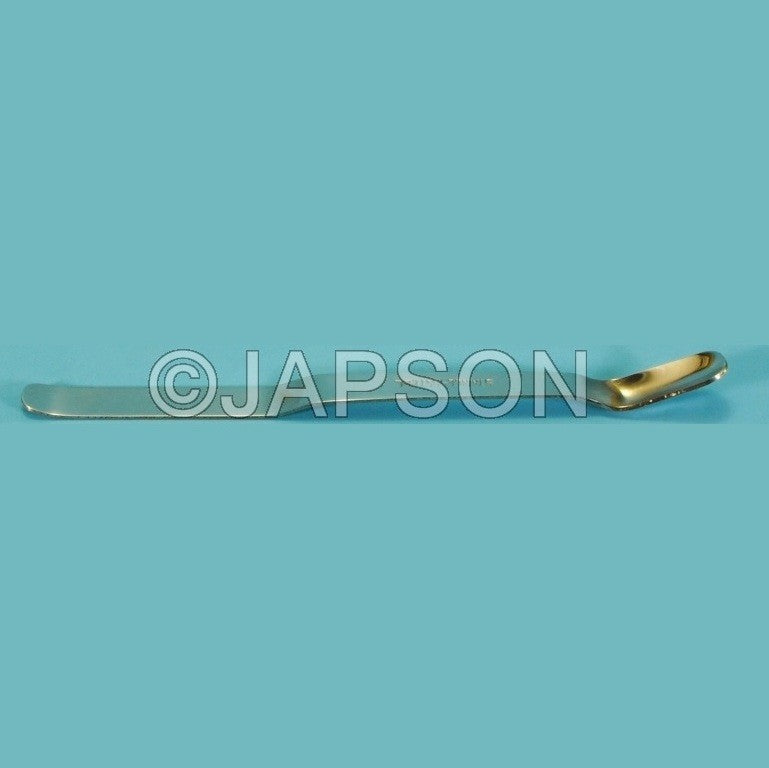 Stainless Steel. With scoop at one end and narrow bent blade at other end
