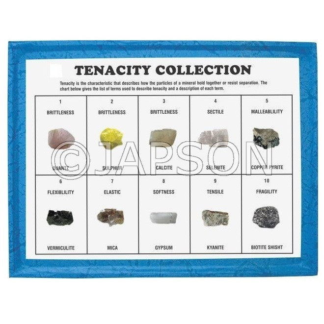 Tenacity is the characteristic that describes how the particles of a mineral hold together or resist separation. The chart below gives the list of terms used to describe tenacity and a description of each term. This collection contains 10 Minerals having Property of Brittleness, Sectile, Malleablility, Flexiblility, Elastic, Softness, Tensile & Fragility Tenacity.
