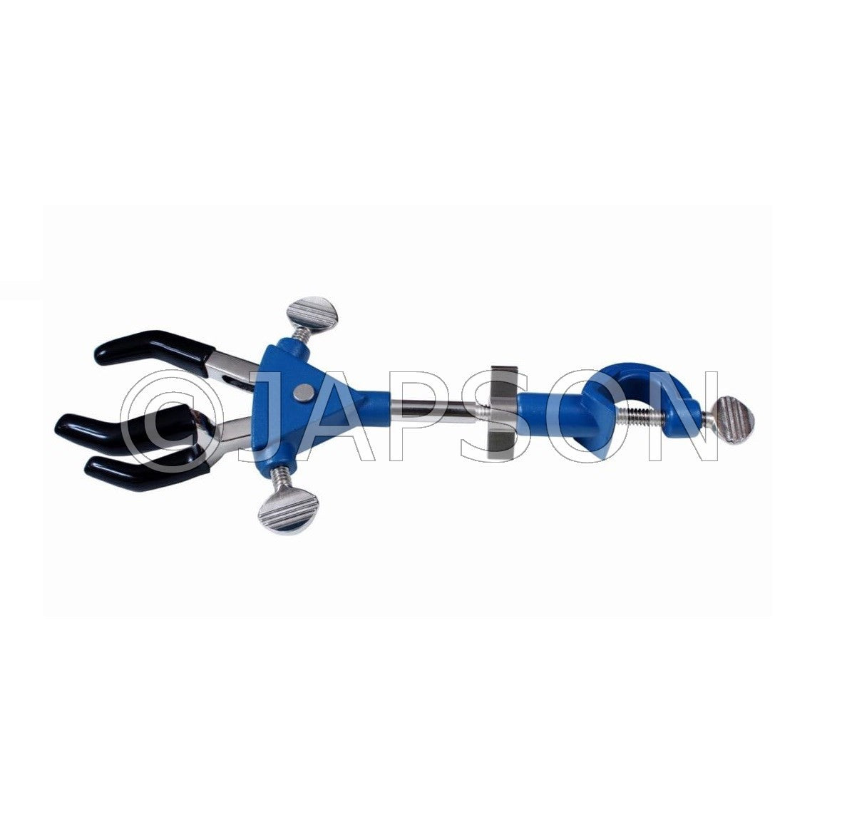 Made of pressure die cast zinc alloy, powder coated body three prong pvc sleeves covered jaw is double adjustable type with the help of double mild steel thumb type screw keys. Clamp rotatable & lockable at any angle fitted with a boss head with mild steel thumb type screw keys accepts objects up to 65 mm diameter.